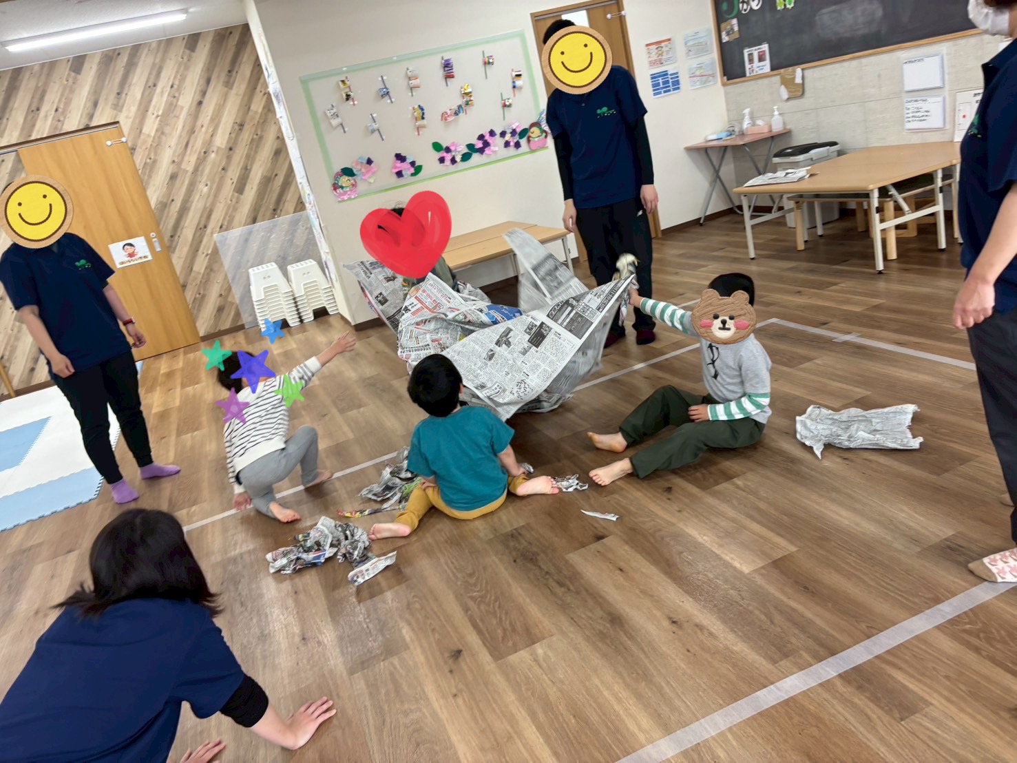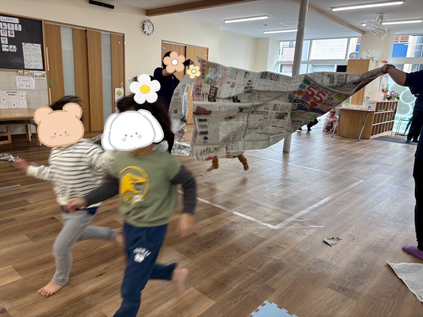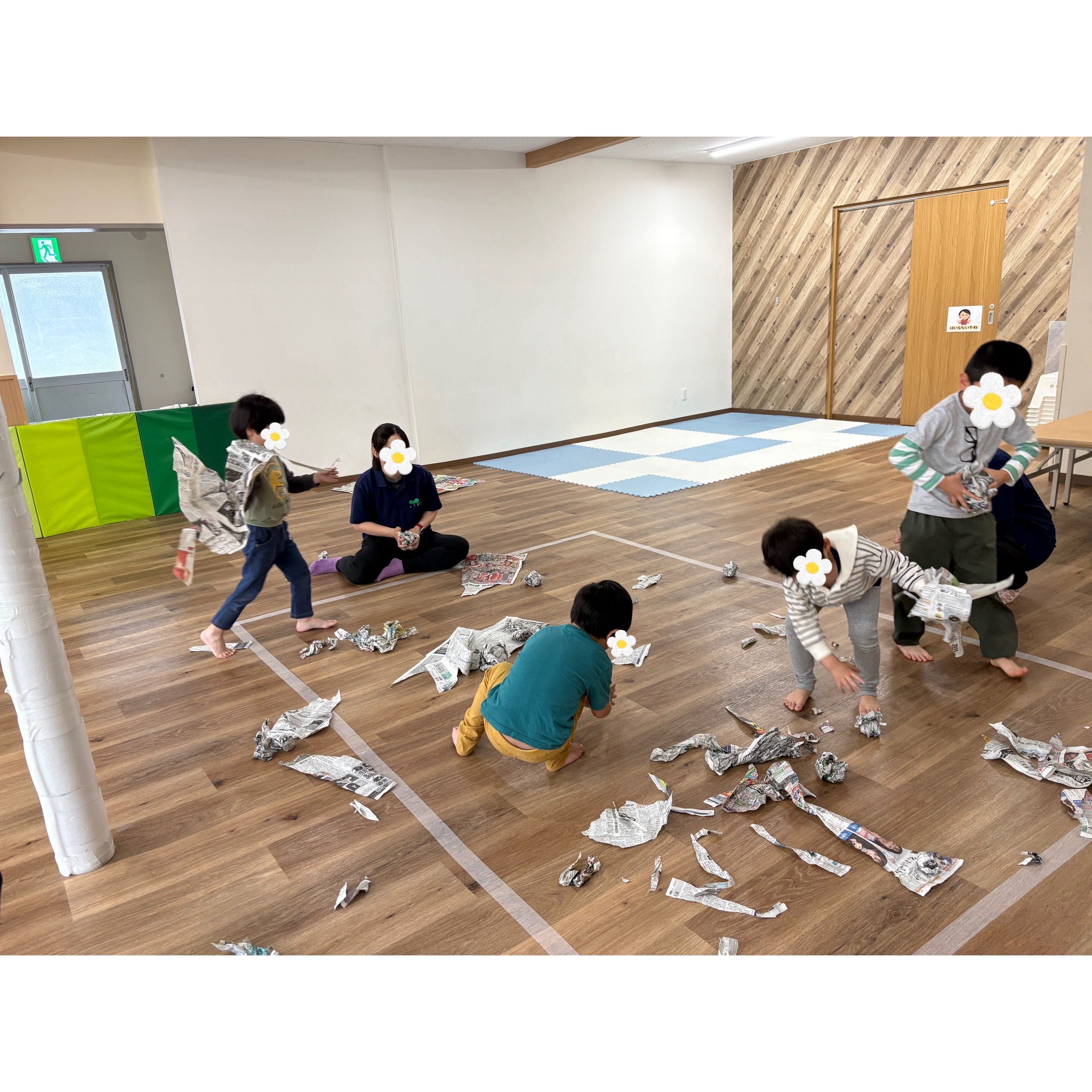 ビリビリ破ったり丸めたり、引っぱりあったり、大きな新聞紙に向かって走ってみたり包まれてみたり子どもたちも「たのしぃ~」「またやりたい~」「いえでもやろうかな」と楽しんでくれました♬