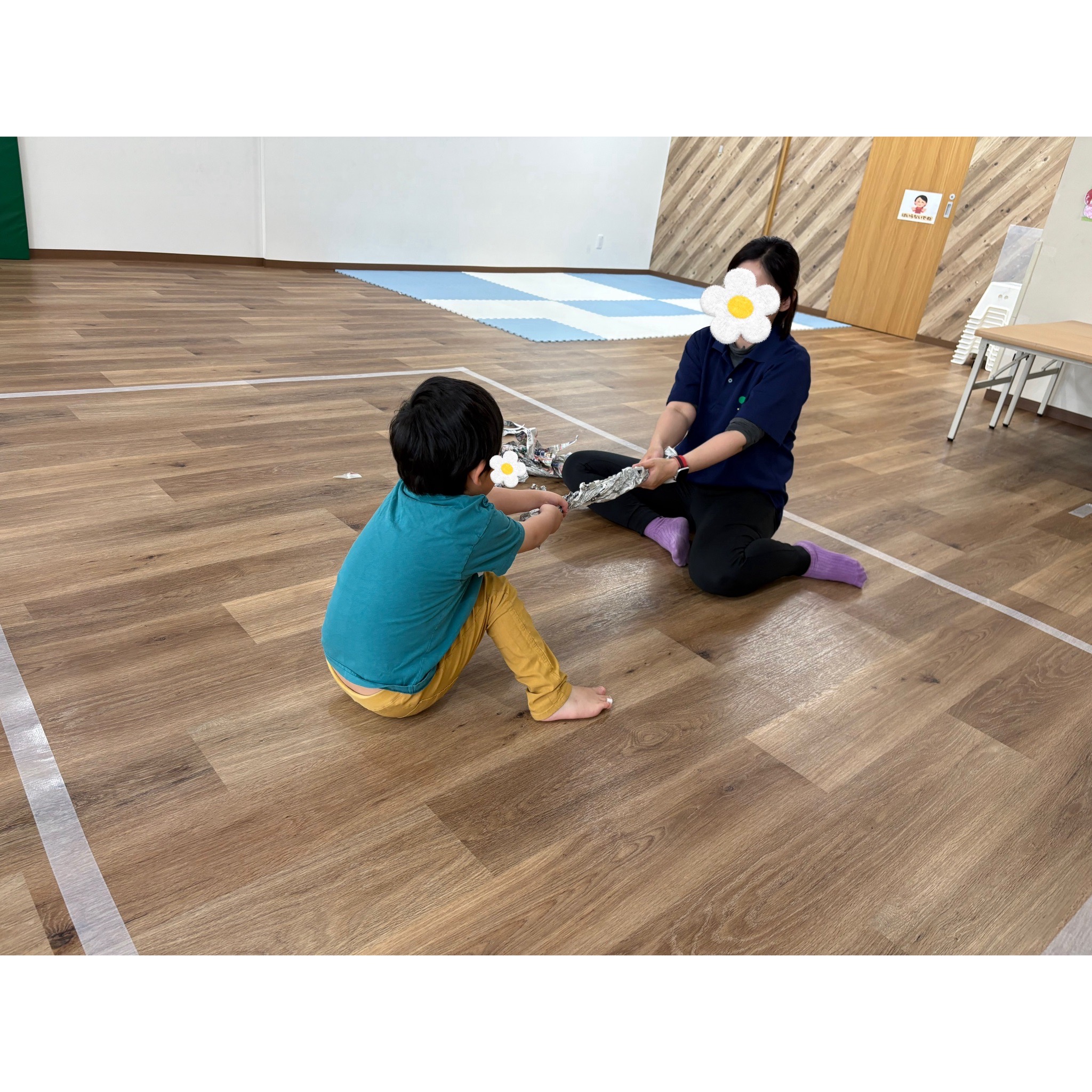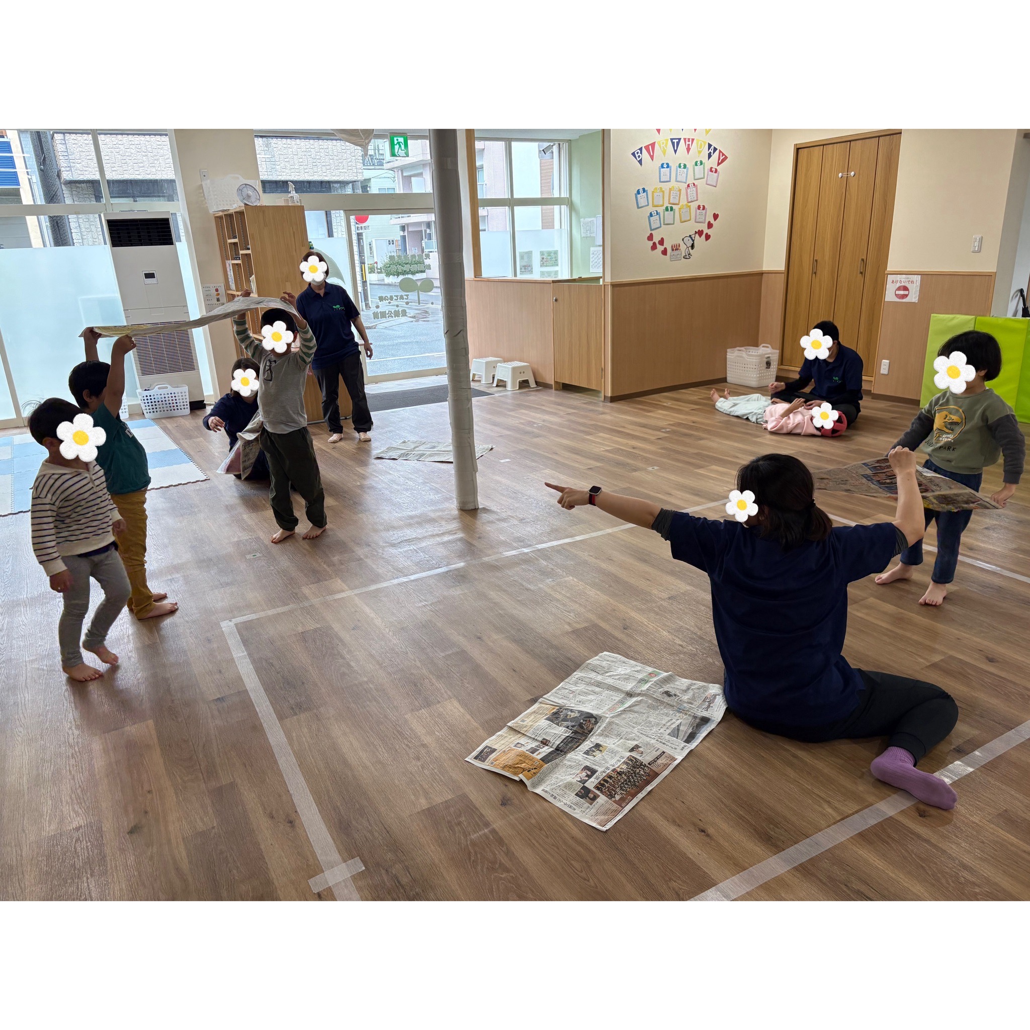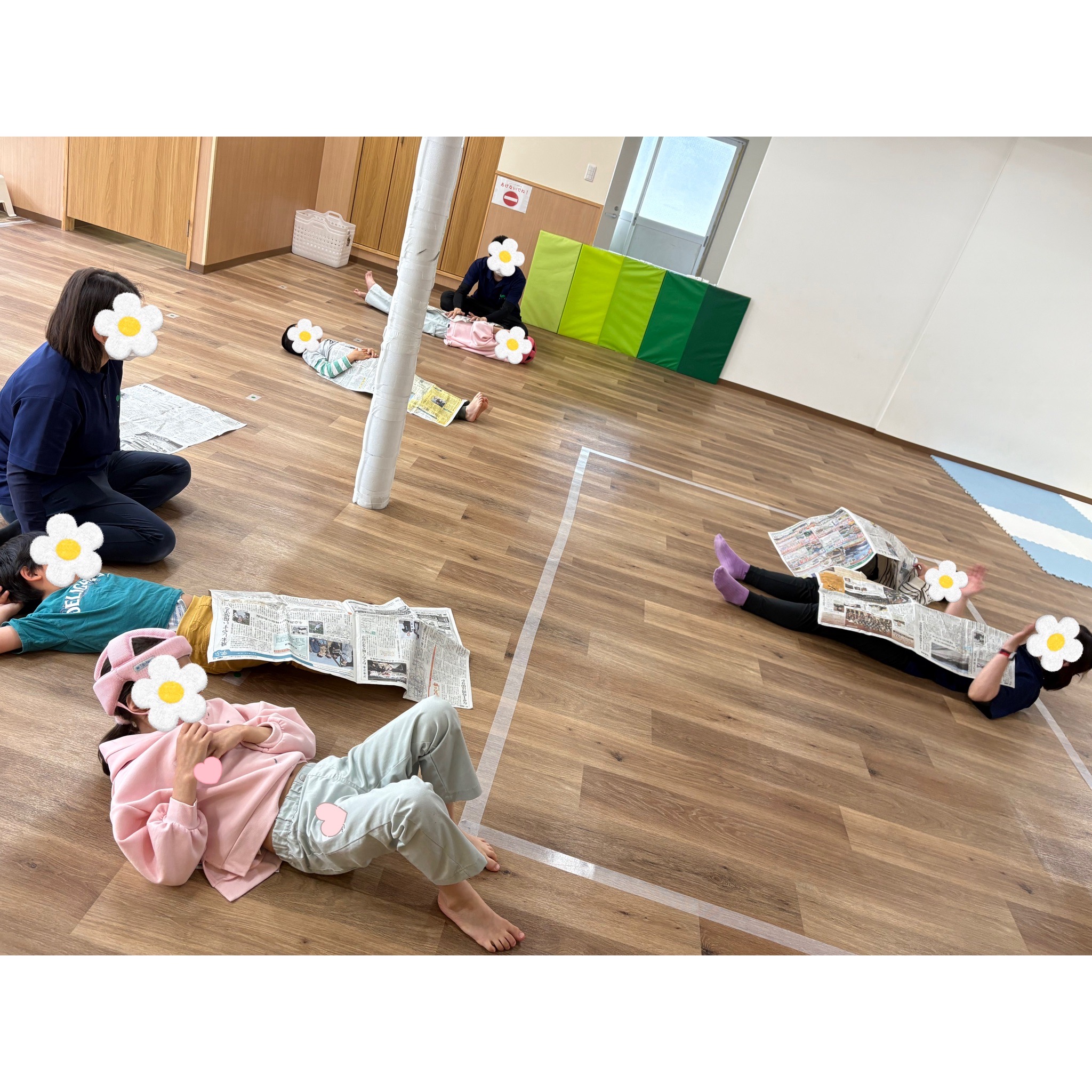 ビリビリ破ったり丸めたり、引っぱりあったり、大きな新聞紙に向かって走ってみたり包まれてみたり子どもたちも「たのしぃ~」「またやりたい~」「いえでもやろうかな」と楽しんでくれました♬