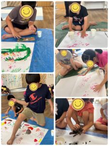 大きな紙に筆を使わずに手や足を使って自由にお絵かき🖌