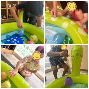 手で水にうたれる感触を楽しんだり服の中に入れたりそれぞれの遊び方で楽しみました😆