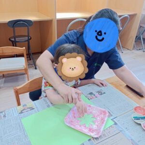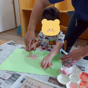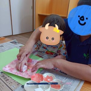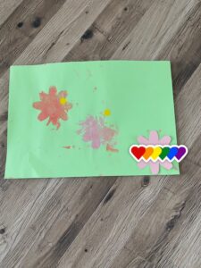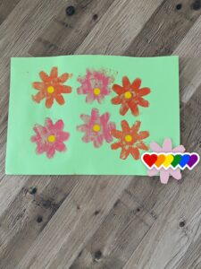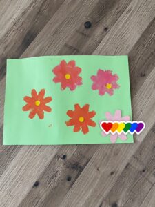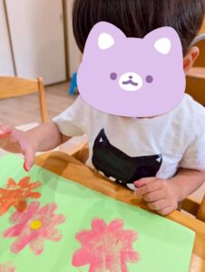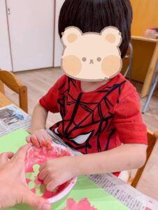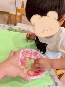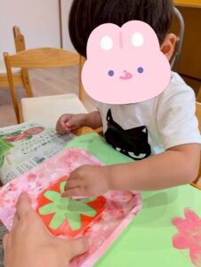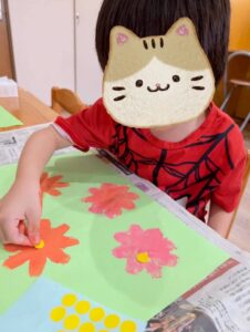 ①コスモスの形にくり抜かれているトレイを画用紙にのせます。