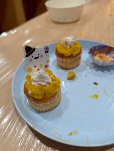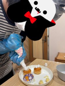 次に、プチケーキの真ん中を細いスプーンでくり抜いてクリームを注入🍦