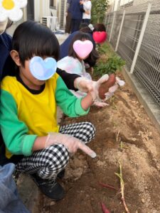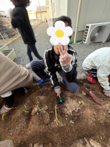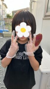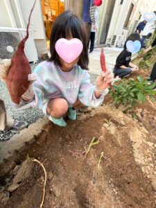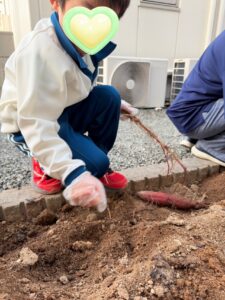 毎年恒例の、、、芋掘り〜〜〜!🍠🍠🧤🧤 ビニール手袋をつけて中庭へ! 大きなさつまいもを掘り出すことができました🤩🍠 このさつまいもを使って何を作ろうかな〜??💭