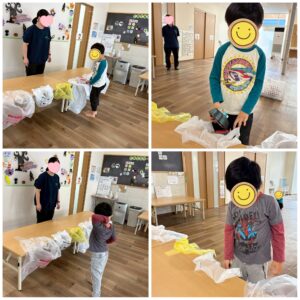 児童発達支援のお友達とは何ゴミがあるのか、何ゴミだからこの袋に捨てるだねと一緒に確認しながら行いました。