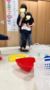 慣れてくるとボールの色と同じ色のカゴを狙って投げる子も◎