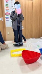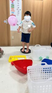 バランスボードに乗った状態でボールや風船をかごに入れていく、というシンプルなルール☺️