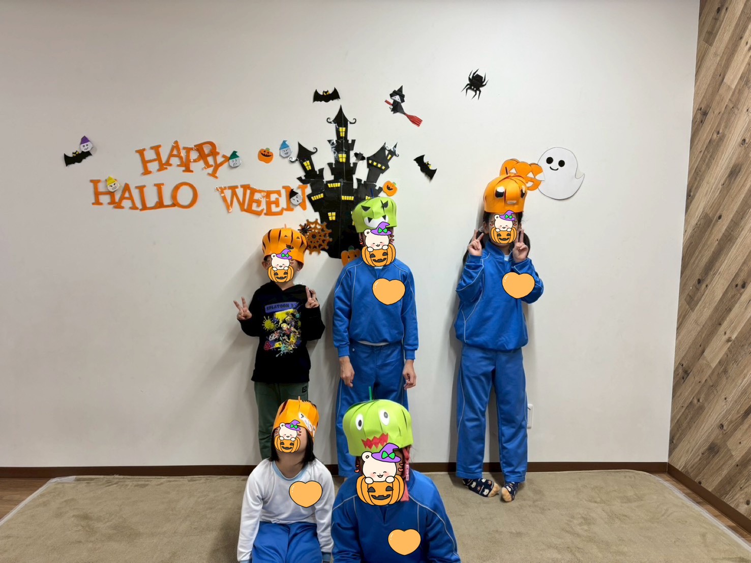 自分たちで作ったかぼちゃの帽子をかぶったり