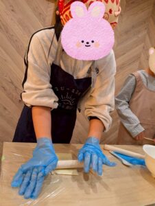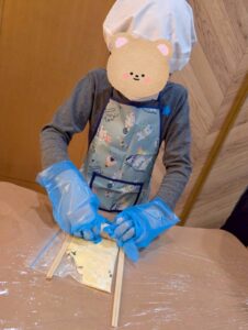 プリッツの部分は、袋に入れた生地をめん棒で伸ばし、