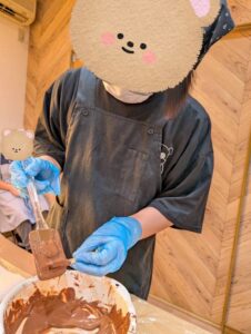 コーティング用のチョコレートはペアになって湯煎作業。