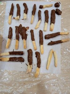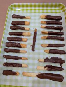 ゴムベラを使ってプリッツをくるくる回転させながらチョコをつける技を編み出す子も😁