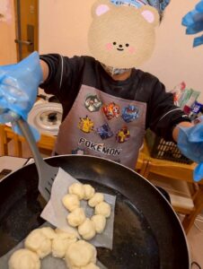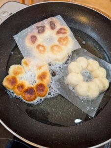 クッキングシートをつけたまま生地を揚げる際、『外さないの?』と疑問を感じる子どもたち🤔