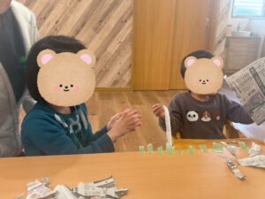 新聞紙をちぎって丸めてテープで止めれば、豆のできあがり🙌