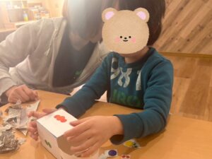 赤・青・黄・緑のシールを枡に貼り、可愛らしい枡が完成しました😁