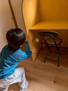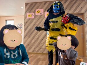 節分当日、ペットボトルで作った鬼が、てあてるの中に隠れてしまいました😧